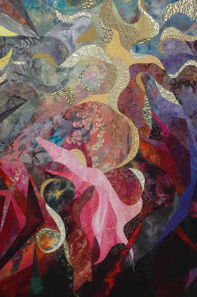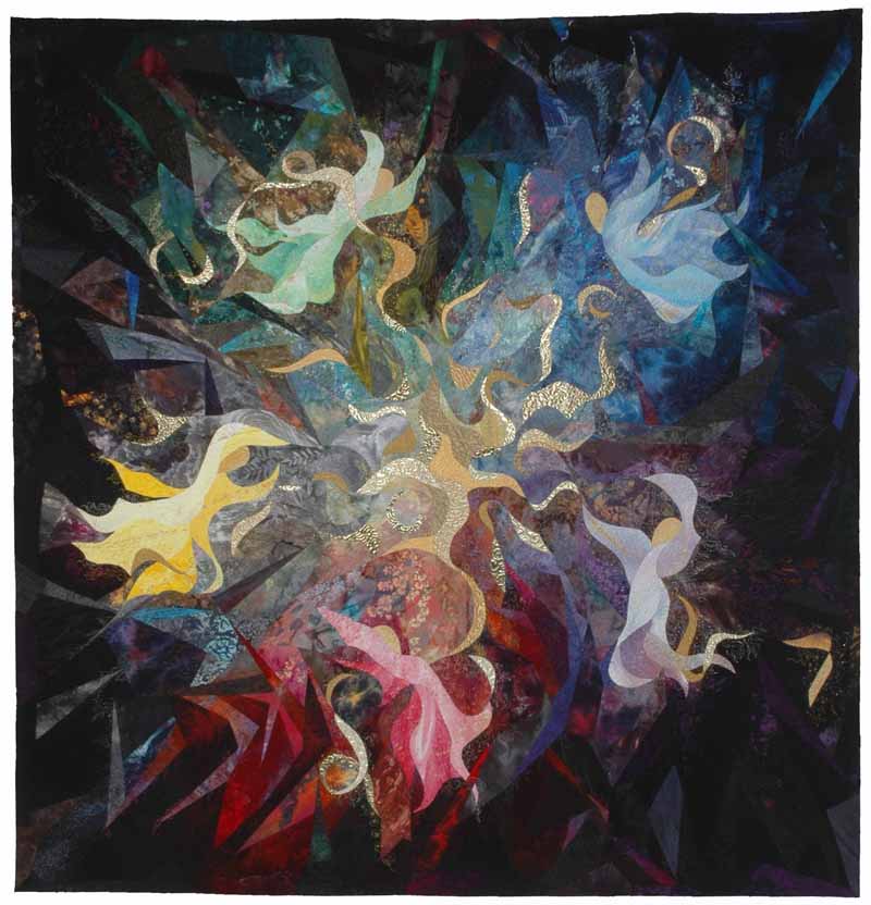 Passages of the Spirit Earthly life is plagues with struggles and human frailties, symbolized in this quilt with somber background colors: red (anger); green (jealousy, hopelessness); gray (anxiety); blue( sadness); and purple (sorrow). The broken jagged points are discord and conflict. My faith is that in the next life I'll conquer these failings and my purer sprit will transform into joy (yellow), love (pink), hope (green), serenity (blue) and spirituality (violet) in the presence of my Creator (gold).