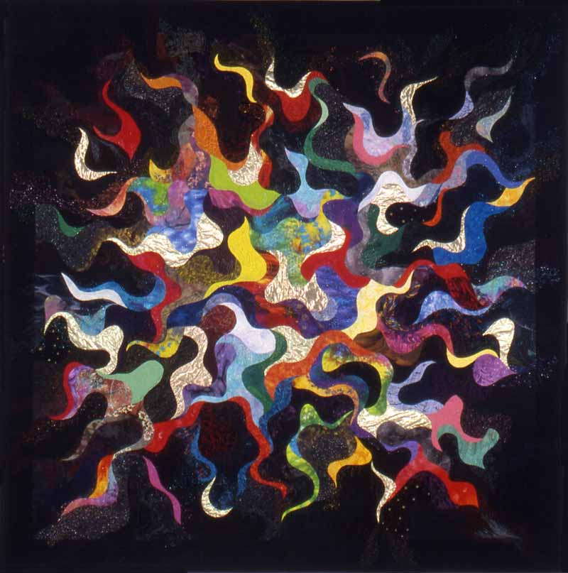 Portrait of My Soul The idea and inspiration for this quilt was conceived during a church service. Instead of paying attention I was daydreaming. As my mind wandered, I clearly visualized an image that I feel portrays my spirit. I see my spirit as a sunburst of energy, swirling and constantly moving, almost flickering. The vivid, colorful flame-like shapes depict the emotions that affect me. Red stands for love and passion; purple is spirituality and sorrow; blue, happiness; yellow, joy; gray is my fear and anxiety; etc. The gold lamé represents God. The black surrounding my spirit symbolizes the world. I completed the quilt exactly how I visualized it that evening in church.