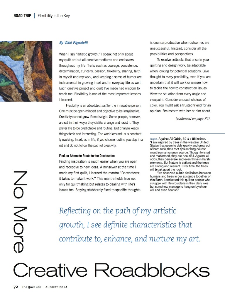 Vikki has an article, "No More Creative Roadblocks", out in the August issue of Quilt Life. The article, discussing the necessity of staying flexible and open-minded during the creative process, is based on an excerpt from Nurture Your Creative Spirit: Wisdom Learned through the Art of Quilting.